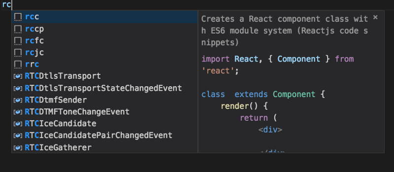 你可以在代码编辑器中安装许多不同的代码片段库。我用于 VS Code 的叫做 ES7 React/Redux/React-Native/JS Snippets。
