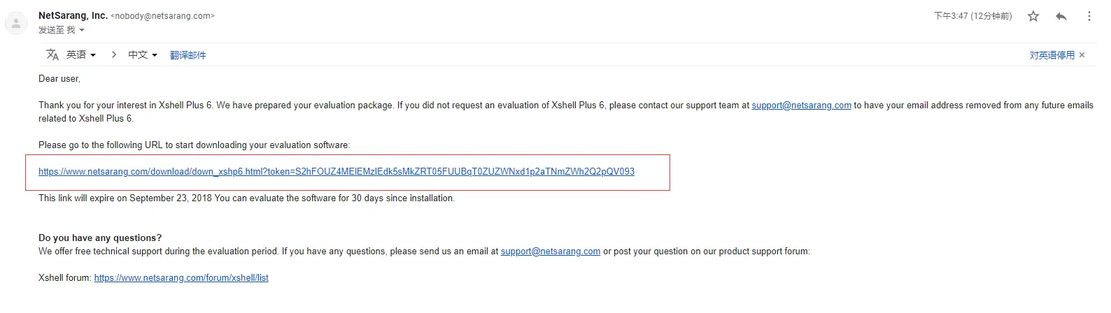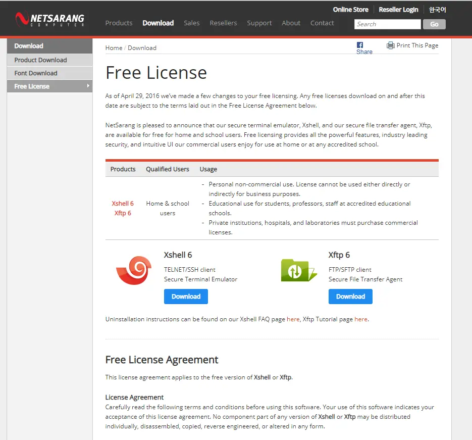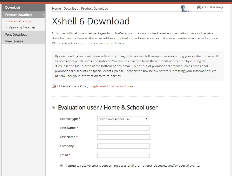 xshell免费版下载安装 玫翠慧 2018-08-24 405 阅读1分钟 1.进入首页 www.netsarang.com 2.点击free license 鼠标放在Download,点击free License 3.点击要下载的xshell或xftp Download 4.填写信息 选择Home and school use 填写名字和邮箱(用户接收xshell或xftp下载地址) 5.查看邮箱的xshell或xftp下载地址