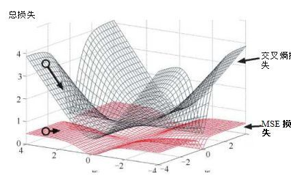 图1-7使用了 MSE均方误差损失函数和交叉熵损失函数。MSE损失函数收敛速度慢,可能会陷入 局部最优解;而交叉熵损失函数的收敛速度较MSE快,且较为容易找到函数最优解