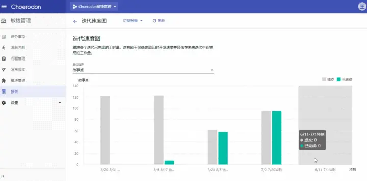敏捷管理服务新增了迭代速度图、史诗报告、统计图三个报告,并且可以对版本、史诗进行拖动排序,详情如下:
