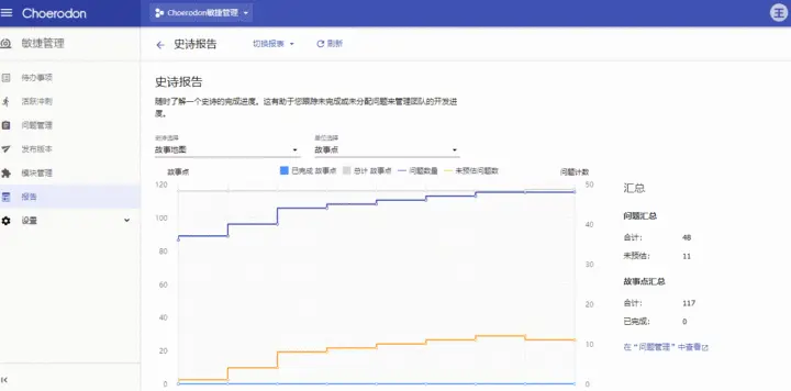 - 史诗报告:用户可以选择不同史诗,通过故事点、问题计数、剩余时间查看当前冲刺的已完成、未完成、未预估的问题,同时还可以查看对应的汇总数据,跟踪未完成或未分配问题来管理团队的开发进度。横坐标代表时间,左侧纵坐标代表统计值,右侧纵坐标代表问题计数,点击问题名称,能跳转至问题详情页。