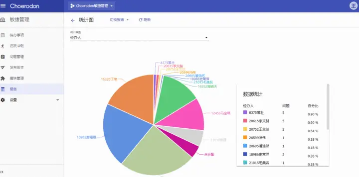 - 统计图功能:用户可以根据经办人、模块、问题类型、修复版本、优先级、状态、冲刺、史诗、解决结果查看项目下的问题统计饼图。按图表的图例来区别筛选出的各类问题数量占所有问题数量的百分比。停放在不同的区域时,显示其具体名称、包含的问题数和所占百分比。