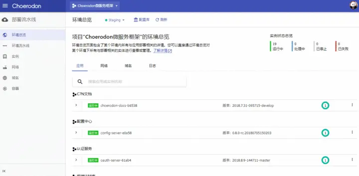 环境总览页面包含了某个环境内所有与应用部署相关的详情,其中主要包括了该环境中各应用实例的具体信息,如:实例状态、名称、应用版本、实例的各种容器信息、日志、网络以及域名的相关信息。所属项目成员均能通过环境总览页面直观的获取到上述信息,部署管理员能在此页面对所选的某个环境下与部署相关的实体进行管理和操作。总的来说,环境总览既是某个所选环境的快捷管理入口,又是此环境的状态显示器。