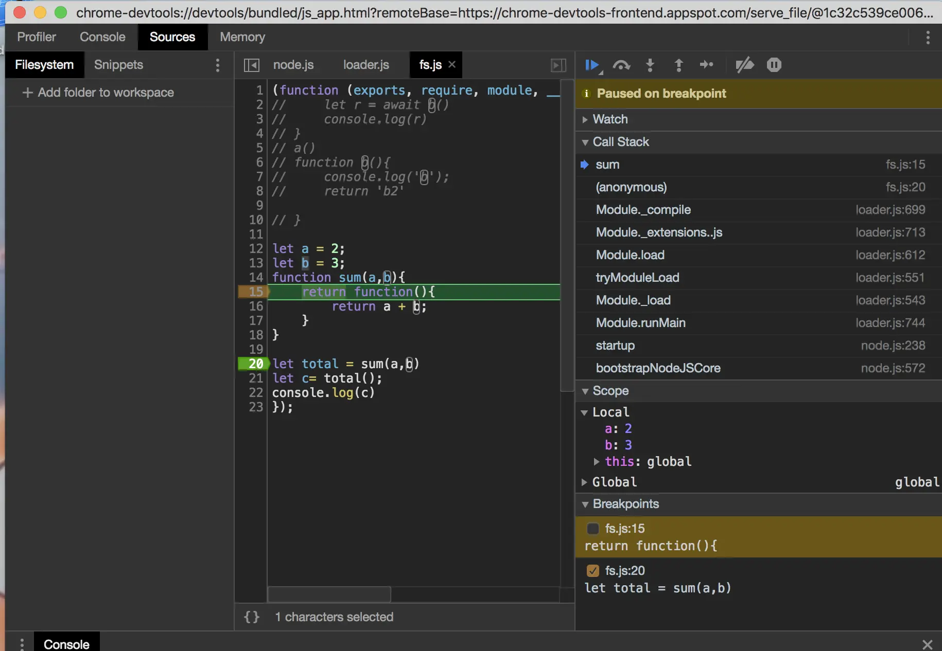 - setBreakpoint('fn()'), sb(...) - 在函数体的第一条语句设置断点。