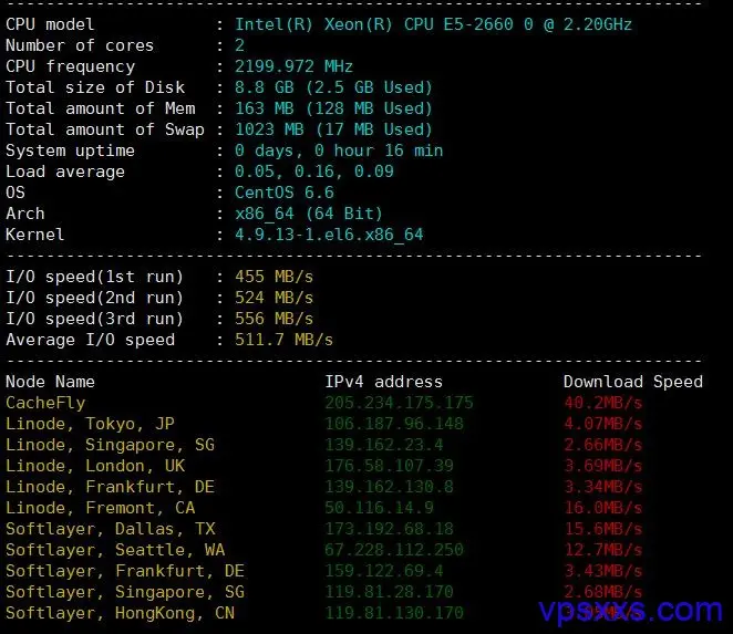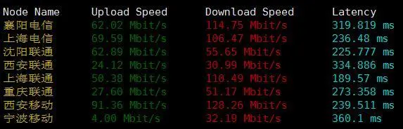 依然是国人商家的“标配”虽然只有256M的内存却给了1G的Swap内存,还是国人懂国人。超低价VPS给2个核心的不多,虽然频率有所限制。硬盘速度可以看到表现的很不错了,一般超低价VPS硬盘IO上200M的都很少。国外下载速度应该是限制10M了,不过没事,我们都只关心国内下载速度,看下国内下载速度: