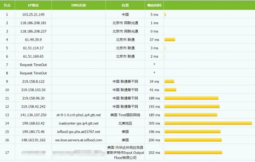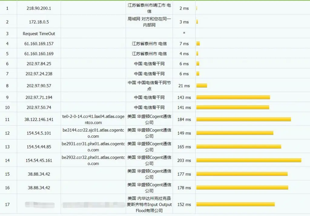 国内下载速度飞快啊,最低也30M了,不少地方都超过100M了,表现非常好,难得的是上传速度普遍大于50M表现非常优秀。下面看下路由情况: