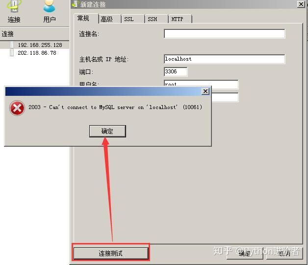 4、输入完成之后,点击左下方的“连接测试”。如果测试失败的话,则会有错误提示,如下图所示。