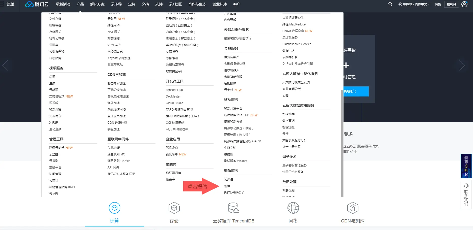 - 登录腾讯云,标题栏 => 产品 => 通信服务 => 短信 => 立即申请