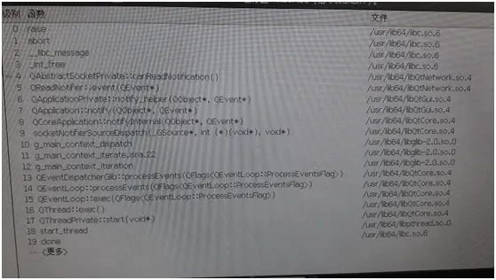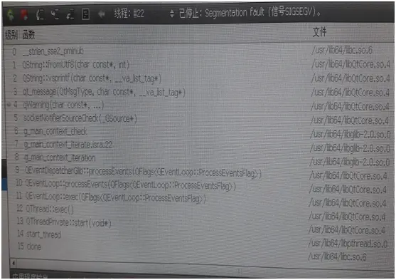 该代码在网络数据量不高时比如10kB/s能够正常工作,但是当软件系统网络数据包为30kB/s以及以上时,发现程序运行一段时间后直接报段错误,软件异常时的栈调用如下所示: