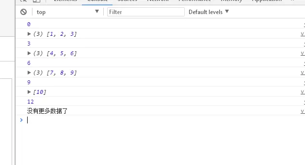 each函数就是一个迭代器,对外接收一个数组参数ary和步长limit(每次输出的数组项数),提供一个next的方法,当我们需要使用时new一个each对象 e , 每次我们只需调用e.next() 就可以得到数组下次内容。这里我们每次输出数组的3个项。log的内容如图: