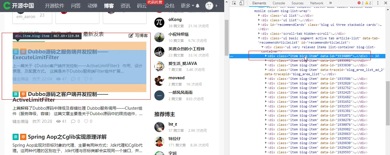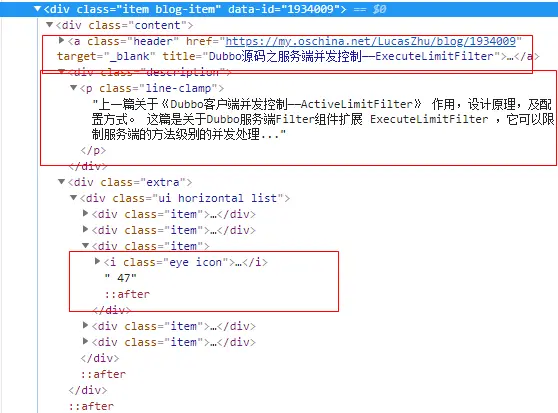 可以看到,一篇文章的相关信息就是一个 div, class 属性为 item blog-item,打开该 div,如下: