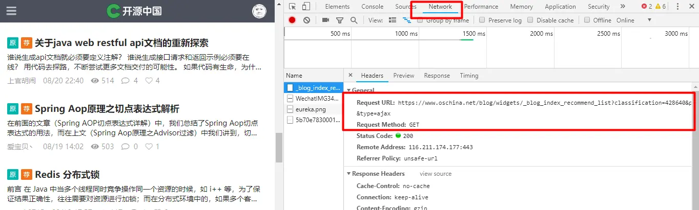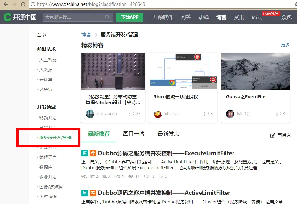 首先浏览器输入 www.oschina.net/ 进入开源中国官网,点击顶部导航栏的 “博客” 选项进入博客列表页面,之后点击左侧 “服务端开发与管理” 选项,我们要爬取的是服务端相关的文章,如下图所示: