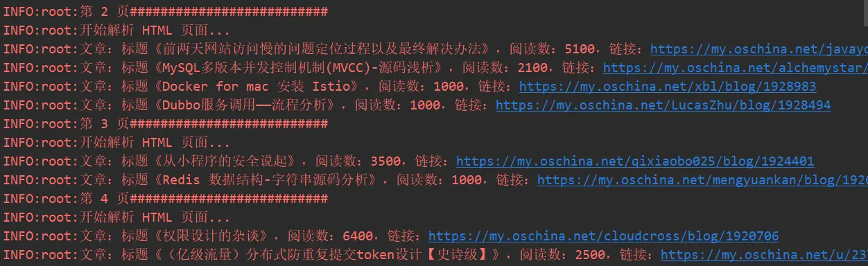 上述代码就是主要的获取相关信息的逻辑,因为阅读数没有唯一id,或者 class ,所有可以通过 find_next_sibling 来获取兄弟节点;