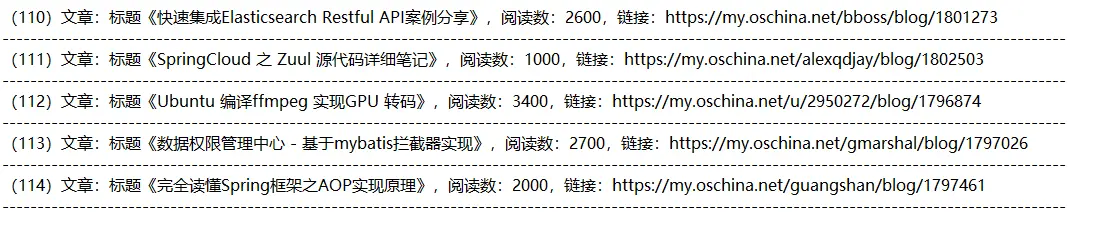 (114)文章:标题《完全读懂Spring框架之AOP实现原理》,阅读数:2000,链接:https://my.oschina.net/guangshan/blog/1797461