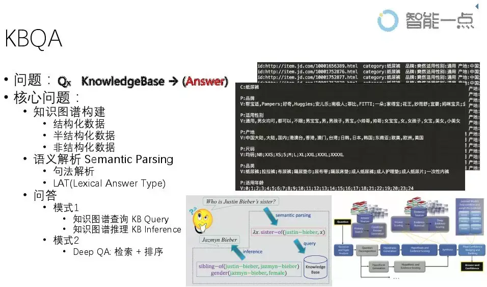 但是现实应用场景中,用户的提问是多种多样的,比如用户会问很多关于尺码的问题,如果参数展开会是指数级。还有明天有没有活动,今天问和明天问是不一样的。如果使用前面的基于问答库的问答方式无法支持,因此基于知识图谱的问答就显得比较重要。第三种方式一般涉及三类问题,第一个是知识图谱如何构建,怎么从结构化数据、非结构化数据还有半结构化数据中构建知识图谱;第二个是如何理解用户的问题输入;第三个是如何生成回复答案。对于后面两个问题,一般有两个常见解决方案:第一种解决方案是首先对句子进行理解然后将其转化为数据库查询,根据查询结果回复;第二种是IBM werson采用的模式,重点关注问题答案的类型是什么,然后通过检索和排序方法支持。
