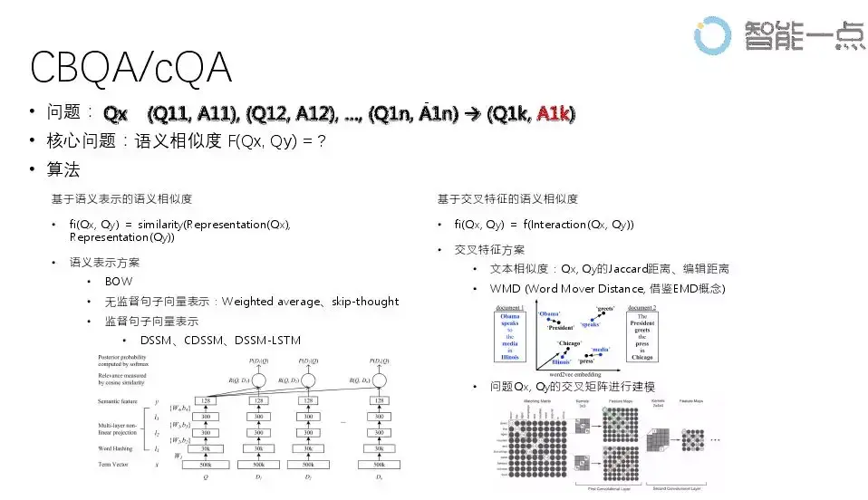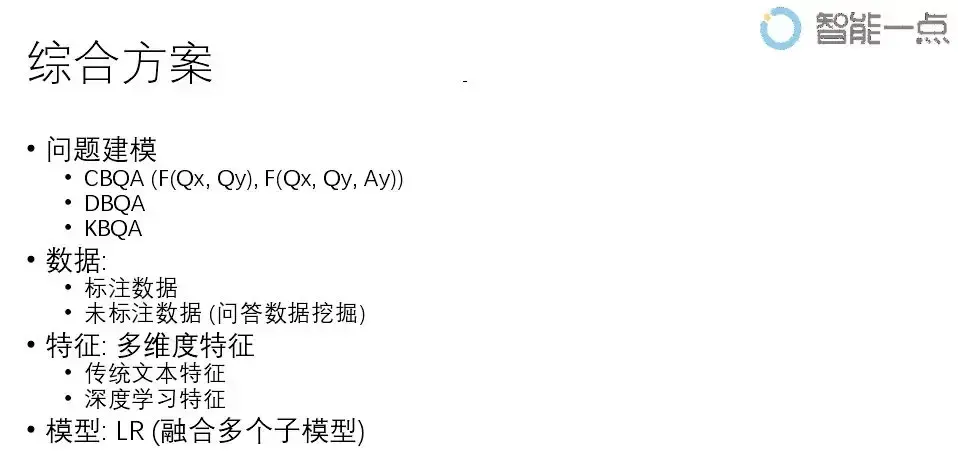 我们的解决方案是对前面三种方案进行了融合,比如在做智能问答时,最简单的方案是只考虑问题含义是否一样。其实我们可以首先判断问题含义是否一样,也可用第二种方式,这个答案是否回复了这个问题,因此可以考虑更多的信息。然后利用LR模型融合更多的特征。