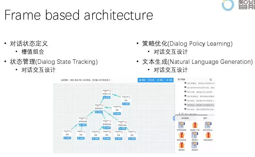 对话管理一般分为两大类,一种是预先自定义的图架构,通过事先自定义进行维护,对话的状态可以用id来定义,每个节点就是一个状态,每个节点的转移或者要回复的文本都是系统预先定义好的。这种方式系统难维护,尤其状态较多时。第二种是Frame based架构,将状态表示为槽的组合,策略状态优化、文本生成等都是通过相关配置完成,从而实现设计与现实的解耦。比如导购机器人,开发人员并不是一个好的对话机器人设计师,导购专家可以通过这个平台实现他们的想法。目的是让导购专家无需了解技术实现面向用户体验的平台设计,交互平台支持配置要实现哪些意图、如何交互以及交互方式是怎样。管理平台维护商品活动信息,所有的相关信息都会进入知识图谱形成图谱。设计统一的描述语言,要求表达能力强,对话交互系统依据描述语言和知识图谱进行最终交互。技术人员着重解决如何构建表达能力强的描述语言,设计人员着重于提升用户体验。电商存在潮汐现象,平常和活动差异很大,在平常对导购机器人有更高的需求,需要如何提升客户转化率。