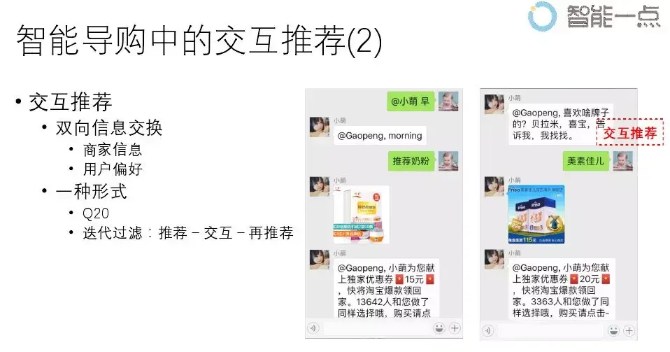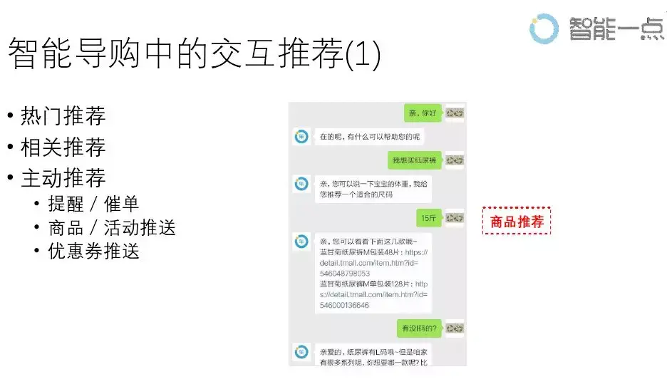 在对话交互过程中做推荐有什么不同。传统推荐很多依赖隐式反馈,比如在看今日头条、抖音等,会根据你的浏览、点击、购买等信息来判断是否对某一产品感兴趣。但是在对话交互过程中可以结合更多丰富的信息,可以获得一个显式反馈,比如去餐馆吃饭,服务员问你要吃什么,这是一个获得显式反馈的。在导购过程中的推荐有:热门推荐、相关推荐,还有主动推荐,比如提醒/催单,还有最近相关活动推荐,还有优惠券推荐。比如客户买了90片S码纸尿裤,使用S码纸尿裤的小孩的纸尿裤每天用量大,那么,我们可以在第七天或第八天对他进行纸尿裤优惠券推荐;而对于L码时,就要在30-40天之后再发起相关推荐和优惠券推送。