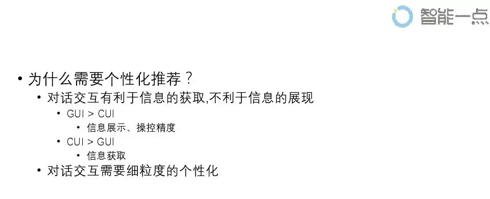 提升客户转化率不单单帮用户省钱而且还帮其赚钱,如何将交互和推荐结合来提高转化率。在CUI之前,GUI比CUI有很多优点,比如:GUI信息展示更好,GUI操作精准度更高,基本100%,但是CUI很难做到百分之百。但是CUI比GUI更容易信息获取,GUI服务于头部信息,对于长尾信息很难获取,比如在在支付宝找免密支付是很困难的。从用户角度是要结合两者的优点。另外,对话交互场景的个性化需求很强。综合来看,将个性化推荐融入对话场景中显得非常重要。