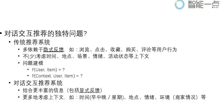 基本流程是开始没有任何限制,然后在没有满足终止条件前,基于限制做一个推荐,第二步,选择下一次交互的参数,需要交互什么东西,然后生成用户回复,经过语义理解发现一个新的限制,然后依据新的限制进行结合不断进行迭代。在商品类型中可以有不同类型,最简单是确定型商品,但是有不同属性,也有可能是一个组装产品,包含不同部分。还有就是反馈部分,以前GUI就是通过点赞/评分、偏好等,CUI就是依据属性咨询。在这其中有一些问题是影响转化效率的,我们如何去和用户推荐,如果交互太多,用户会反感,你为什么问我这么多问题,选择信息量最大的做推荐,可以采用静态策略和动态策略,静态策略就是对所有人先问A属性再问B属性,动态策略比如对于A不同的反馈采取不同的行为。还可以考虑个性化,如一个人每次来都买某个品牌的产品,就不需要再沟通他的品牌偏好了。