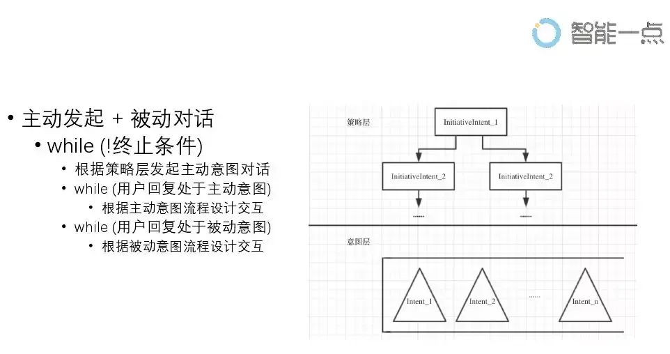 很多情况是用户发起,但是有时候是需要机器人发起,如“Bot: 最近咱们家上线了一款新产品,您要不要了解一下?• User: 你们家用什么快递?• Bot: 通过天猫商城菜鸟仓随机快递发货哦。• Bot: 新款产品,了解下?• User: 好啊• Bot: balabala• User: balabala”,这种解决方案就是分为策略层和意图层。机器人依据一定策略发起对话,发起主动意图,当用户回复在主动意图里面,按主动意图脚本执行,如果用户意图不在主动意图里面,依据被动意图去交互。被动意图交互完依据一定策略继续主动意图,通过这种方式实现机器人主动发起和被动对话的结合。