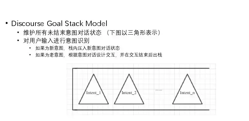 如“User: 刚出生的宝宝,有没有什么纸尿裤推荐?, Bot: 咱们家纸尿裤有好几个系列,您是要超薄的,还是超柔的?, User: 超薄和超柔有什么不同?• Bot: 超薄…,超柔…,User: 看看超薄的?, Bot: 推荐…”对话会发生返回,这种情况很普遍,这其实是多个意图的交叉或偏移,解决方案就是上图三角形是交互平台如何去维护一个场景活动,可能有很多没有结束的产品,在用户输入时判断是否是新的意图,新意图就创建新的场景,将新场景加入堆栈中,如果是老场景,判断是哪一个老意图,然后去交互,完成交互之后将对应场景从栈里拿出,这种方式支持不同意图切换。还有情况是交互过程中无法回复,这种情况是在交互过程中避免说的太过于技术语言。这种涉及到评论挖掘,抽取用户对商品的标签或描述。