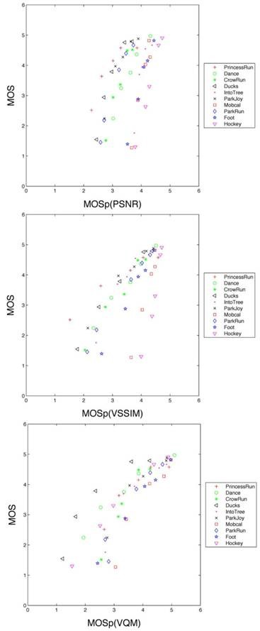 Figure2 PSNR,VSSIM,VQM客观评测分数与主观评测分数对比