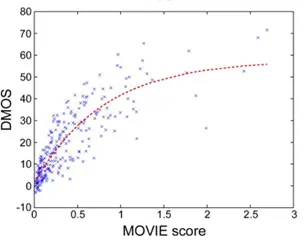 后来,研究人员引入了基于人类视觉系统(HVS)的感知模型,进一步提升了视频质量评估的准确性。这其中比较有代表性的是MOVIE(MOtion-based Video IntegrityEvalution)。这种方法会计算视频中物体的运动矢量,联合时域和空域的失真信息,最终得到一个符合主观感受的失真评价分数。在众多全参考视频质量评估方法中,MOVIE属于结果较为优秀的一种。但是同时,MOVIE的运算复杂度也要远高于前面提及的几种算法。下图横坐标为MOVIE应用在视频质量专家组(VQEG)数据库提供的测试序列上得到的客观评分,纵坐标为主观测试得分。