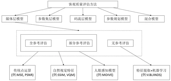而客观评估方法,按照国际电信联盟(ITU)的建议,可以根据输入的数据类型被分为5大类:媒体层(Media-layer)模型、参数集层(Parametric packet-layer)模型、参数规划(Parametric planning)模型、码流层(Bitstream-layer)模型、混合(Hybrid)模型。其中媒体层模型直接使用媒体信息进行运算分析给出评价结果,而其他类型的评估方法则是根据编码参数或网络信道状态等等外部变量来评估质量。