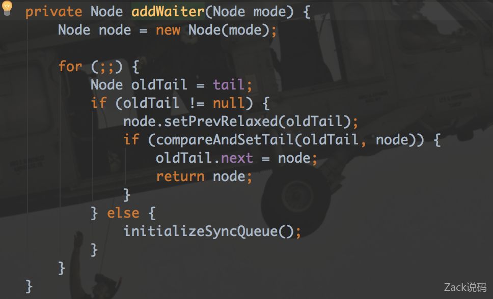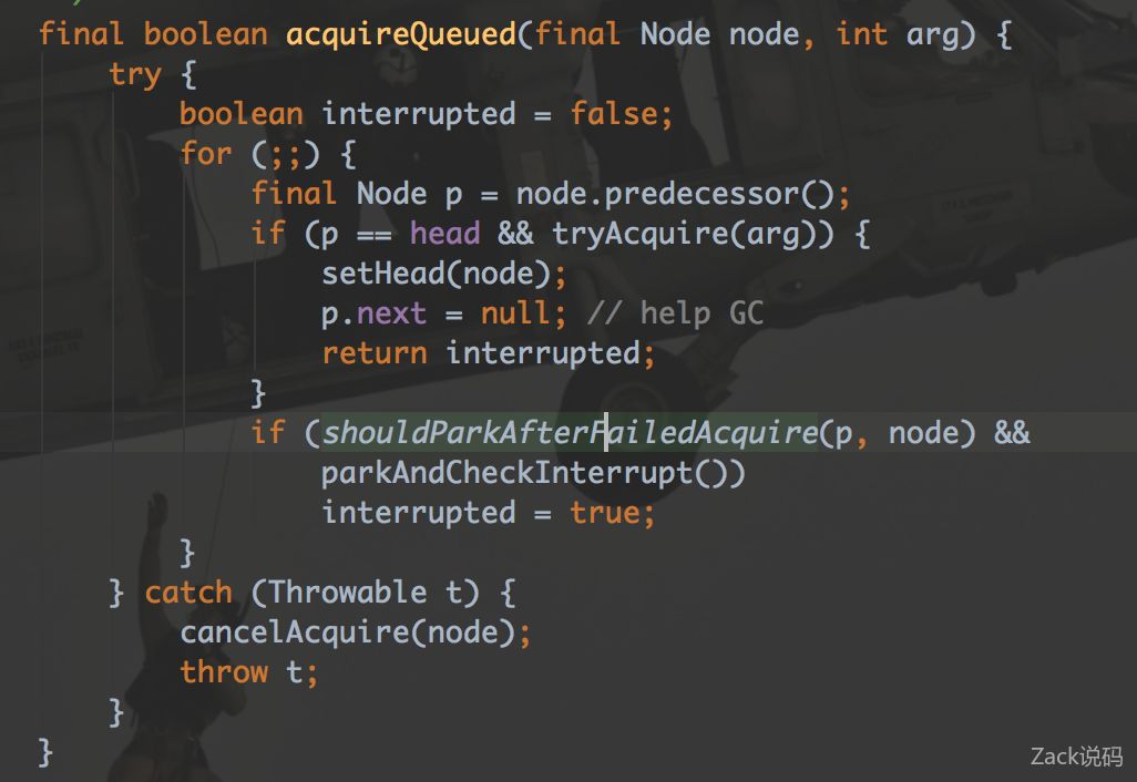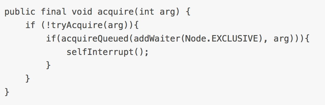 然后把节点丢到acquireQueued()中执行。该方法其实就是自旋尝试获取锁或阻塞线程(子类实现决定)。