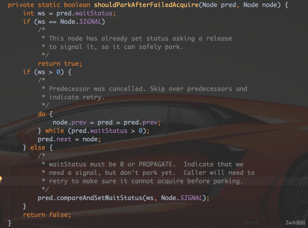 如果还是获取失败,则执行shouldParkAfterFailedAcquire(),根据前驱节点状态(子类设值)判断是否继续自旋(当waitStatus为初始值,重复上一步,直到前面的节点一直在减少到前驱节点为head)或者阻塞线程(当waitStatus标记为SIGNAL)