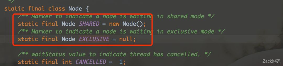 Node还有一个模式的属性:独占模式和共享模式。独占模式下,锁是线程独占的,而共享模式下,锁是可以被多个线程占用的。