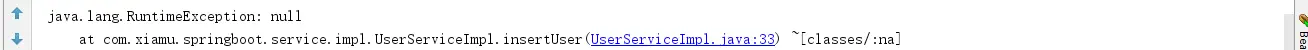 @RestController @RequestMapping("/user") public class UserController { @Resource private UserService userService; @GetMapping("/listUser") public void listUser() throws Exception { userService.listUser(); } @GetMapping("/insertDefault") public void insertDefault() throws Exception { User user = new User("XiaMu", "123456"); System.out.println(userService.hashCode()); userService.insertUser(user); } } @Service public class UserServiceImpl implements UserService { @Resource private UserDao userDao; @Override public void listUser() throws Exception { List<User> users = userDao.listUser(); if (users.isEmpty()) { User user = new User("XiaMu", "123456"); this.insertUser(user); } } @Override @Transactional public void insertUser(User user) throws Exception { userDao.insertUser(user); throw new RuntimeException(); } }