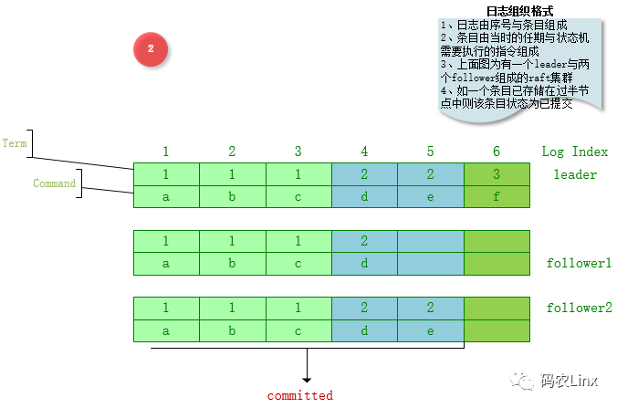 此图介绍了Raft集群中日志的组成结构,日志由序号与条目组成,每个条目又由任期与指令组成,committed范围内为已提交的日志是指过半节点已经接收并存储的日志;