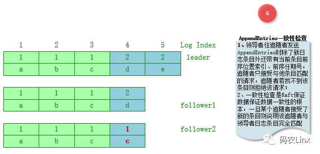 上图中Leader发送AppendEntries请求时带有其前序索引位置4、前序任期号2,发往Follower1、Follower2; Follower1由于前序索引与前序任期能匹配本地条目所以将会接受该请求; Follower2由于前序索引与前序任期未能够匹配所以拒绝该请求;