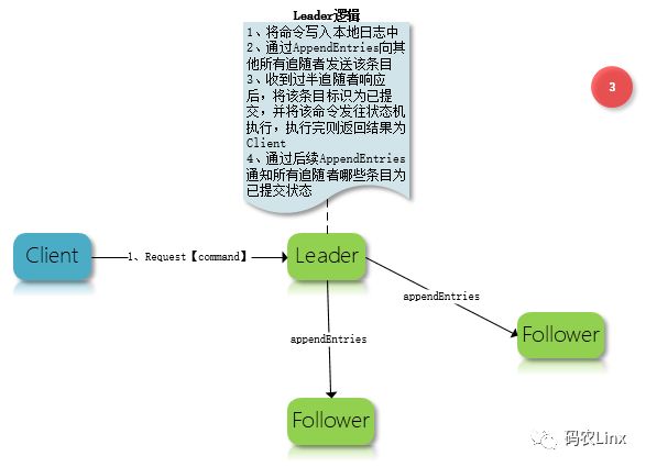上图从整个上介绍了Raft集群的日志复制流程,Leader接收到指令后写入到本地日志,在随后的心跳中(AppendEntries)往其他追随者发送该条目,等待收到过半追随者响应后将该条目标志位已提交状态,并发往状态机执行,完成后返回结果给客户端;在后续心跳包(AppendEntries)中通知所有追随者哪些条目为已提交状态,以便追随者更新在自己状态机中执行该指令; 只有Leader能够接受客户端的指令,追随者只能够接收领导者的AppendEntries请求;