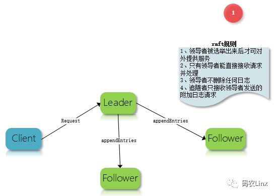 在一个Raft集群中只有Leader节点能够接受客户端的请求,由Leader向其他Follower转发所有请求日志,并且有那么两条规则:Leader不删除任何日志、Follower只接收Leader所发送的日志信息;