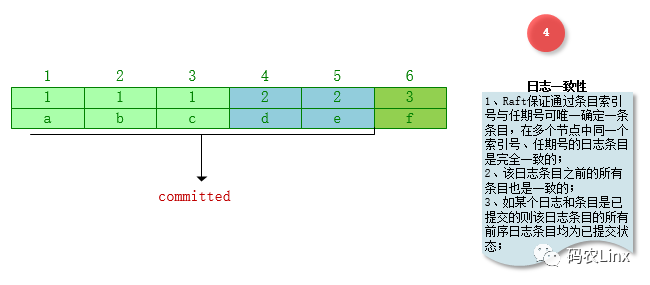 在Raft集群中可通过条目索引号、任期号唯一确定一个条目,该条目前序所有条目也是一致的,如上图中索引号为5的条目为已提交状态的条目,则从索引号1到5的所有条目均为已提交的状态;