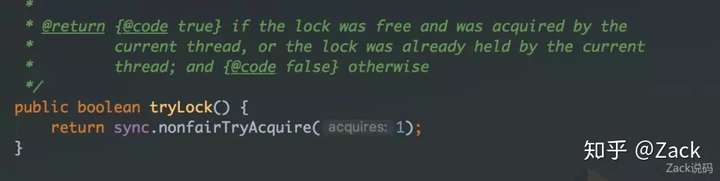 而tryLock()调用的是成员变量sync的nonfairTryAcquire()。上文说到Sync内部类抽象了这个方法出来,说到子类都会用到,说的正是tryLock()方法需要用到。