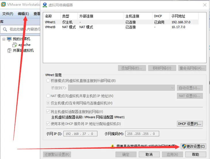 A) VMWare中找到 编辑->虚拟网络编辑->更改设置
