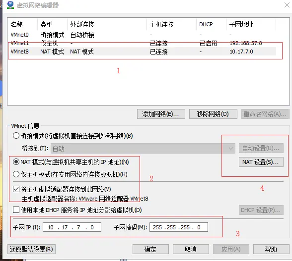 2 选择NAT模式,以及将主机虚拟机适配器连接到此网络