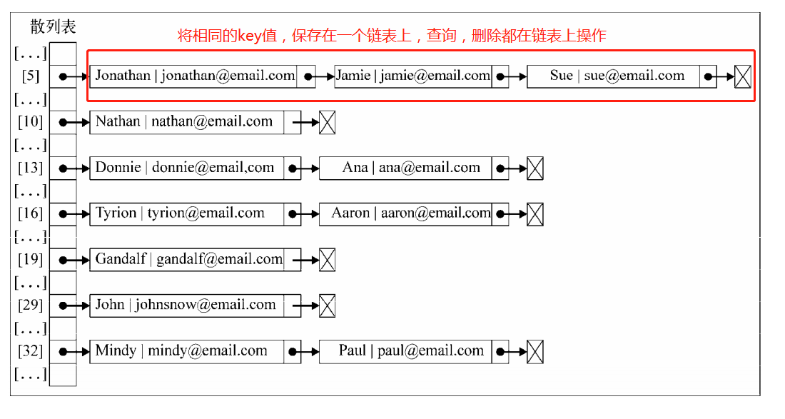 按照上面的顺序,会出现相同key的情况,不同的值在散列表中对应相同位置的时候表示冲突了。解决该问题可用以下方法: