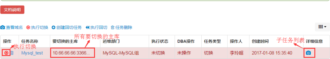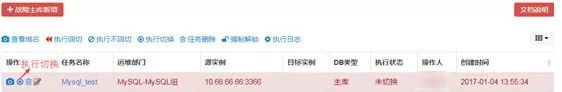 监控系统检测到主库宕机,则自动创建切换任务,进行自动切换或者手动切换,以手动切换为例: