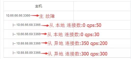 选目标实例,假如例子中的4个从都是存活的,那么根据先本地后异地原则,选出10.66.66.68:3366,10.66.66.69:3366,然后再去查连接数,在连接数都相同的情况下,则去比较QPS,选出QPS负载低的10.66.66.69:3366作为目标实例:
