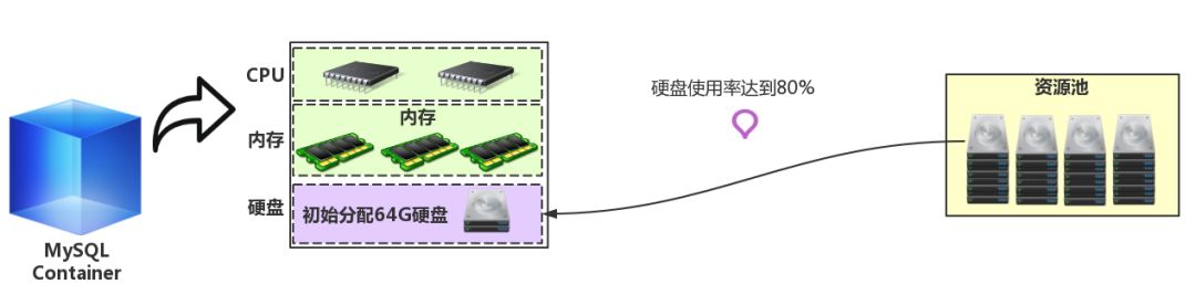 数据库以前的服务存在资源浪费的一个主要原因就是资源初始分配粒度太大,一开始就为业务提前预支3年甚至5年的资源。而资源池中的资源是有限的,不可能让所有业务都提前预支资源,从而导致有些业务没有资源。ContainerDB采用流式的方式进行资源的持续交付。每个业务接入初始都只会分配标准的64G硬盘,随着业务的发展和数据量的持续增加,会持续增加硬盘容量直到到达硬盘限制的上限256G。