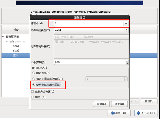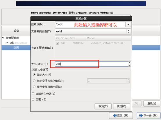 1、 启动分区/boot,分配200m容量,用于系统启动