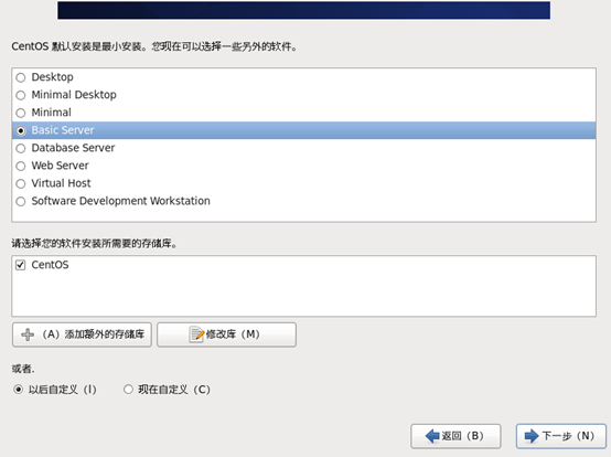 安装选项,生产阶段,大部分选择Minimal最小化安装(安装软件包较少,部分命令不支持),学习阶段,我选择的是Basic Server(基本服务器)安装,此处据实际情况选择;