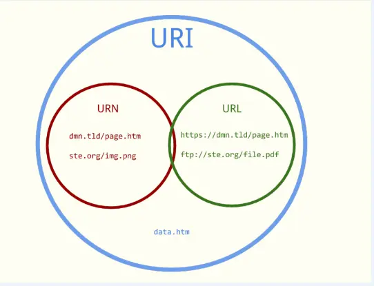 如果是一个人,我们会想到他的姓名和住址。URL类似于住址,它告诉你一种寻找目标的方式(在这个例子中,是通过街道地址找到一个人)。要知道,上述定义同时也是一个URI。相对地,我们可以把一个人的名字看作是URN;因此可以用URN来唯一标识一个实体。由于可能存在同名(姓氏也相同)的情况,所以更准确地说,人名这个例子并不是十分恰当。更为恰当的是书籍的ISBN码和产品在系统内的序列号,尽管没有告诉你用什么方式或者到什么地方去找到目标,但是你有足够的信息来检索到它。