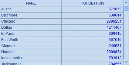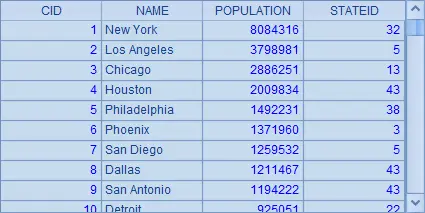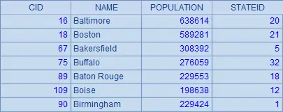 CITIES表中存储了一些城市的人口数据,A1中查询出CITIES的所有内容,结果如下:
