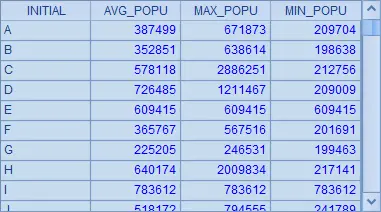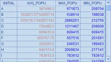 | 3 | =A1.group(left(NAME,1):INITIAL;int(~.avg(POPULATION)):AVG_POPU, ~.max(POPULATION):MAX_POPU, ~.min(POPULATION):MIN_POPU) |